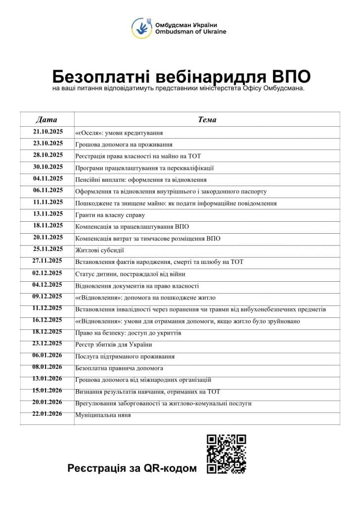 рамках співпраці Секретаріату Уповноваженого Верховної Ради України з прав людини та громадської організації «Відродження України 2022», за підтримки Офісу Ради Європи в Україні заплановано організацію та проведення онлайн вебінарів для внутрішньо переміщених осіб та осіб, які постраждали від збройної агресії проти України.