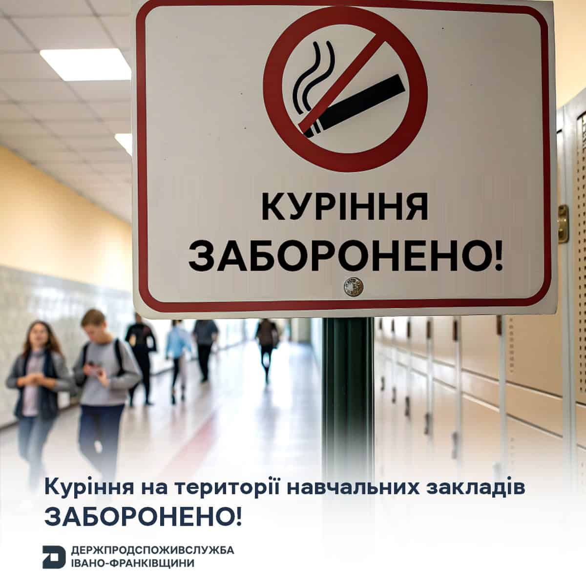 На початку навчального року Головне управління Держпродспоживслужби в Івано-Франківській області нагадує, що статтею 13 антитютюнового закону №2899-IV визначені місця, вільні від куріння, в тому числі ЗАБОРОНЯЄТЬСЯ куріння, вживання та використання тютюнових виробів, предметів, пов’язаних з їх вживанням, трав’яних виробів для куріння, електронних сигарет, пристроїв для споживання тютюнових виробів без їх згоряння, кальянів: