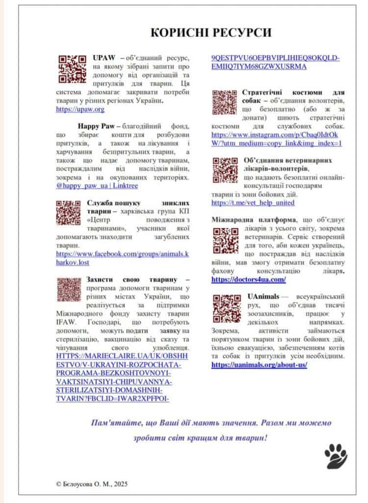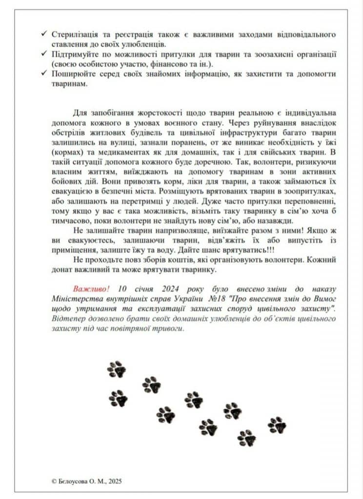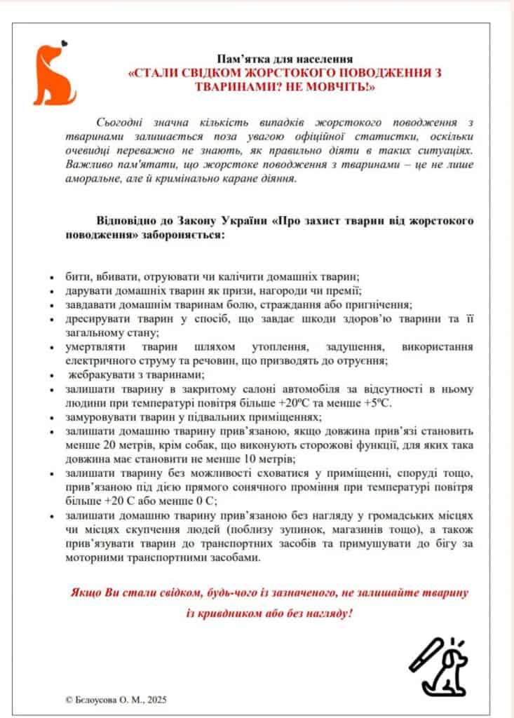 З метою підвищення обізнаності та запобігання жорстокому поводженню з тваринами, особливо в умовах воєнного стану розроблено пам’ятку «Стали свідком жорстокого поводження з тваринами? Не мовчіть!» (можна переглянути на світлинах). У ній містяться корисні поради та рекомендації для громадян.