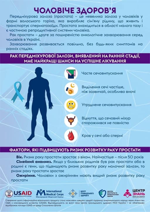 Урамках інформаційної кампанії з підтримки чоловічого здоров’я Центр громадського здоров’я України, за підтримки USAID та International Medical Corps, оприлюднив інфографіку, присвячену профілактиці та ранньому виявленню раку передміхурової залози (простати).