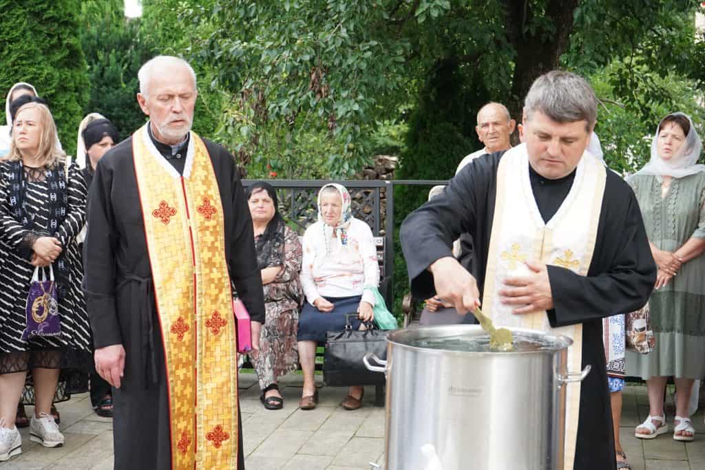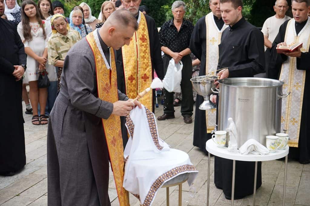 Опісля святі отці та парафіяни вийшли з храму на церковне подвір’я, де священнослужителі звершили Чин освячення води та благословили та освятили нові обруси на престіл, які будуть окрасою святині під час Богослужінь та пригадуватимуть вірянам про муки і жертву Спасителя.
